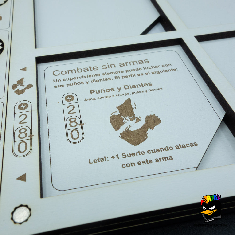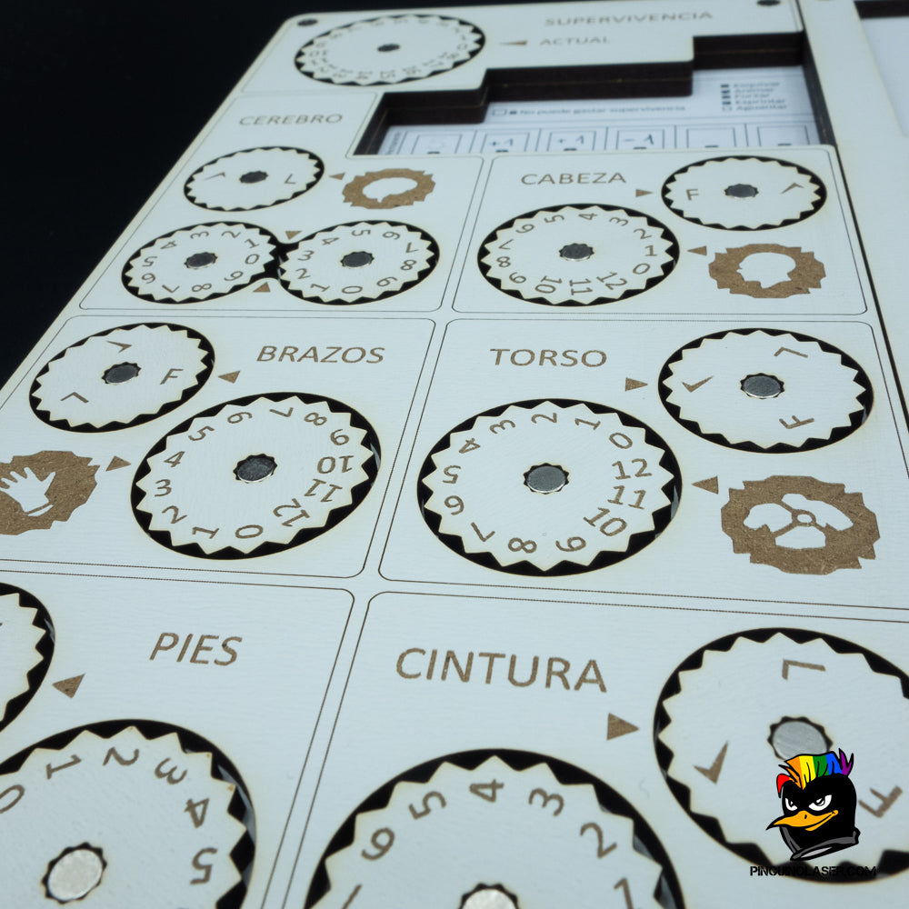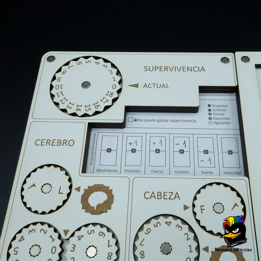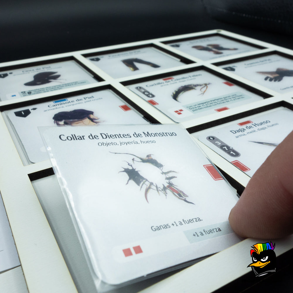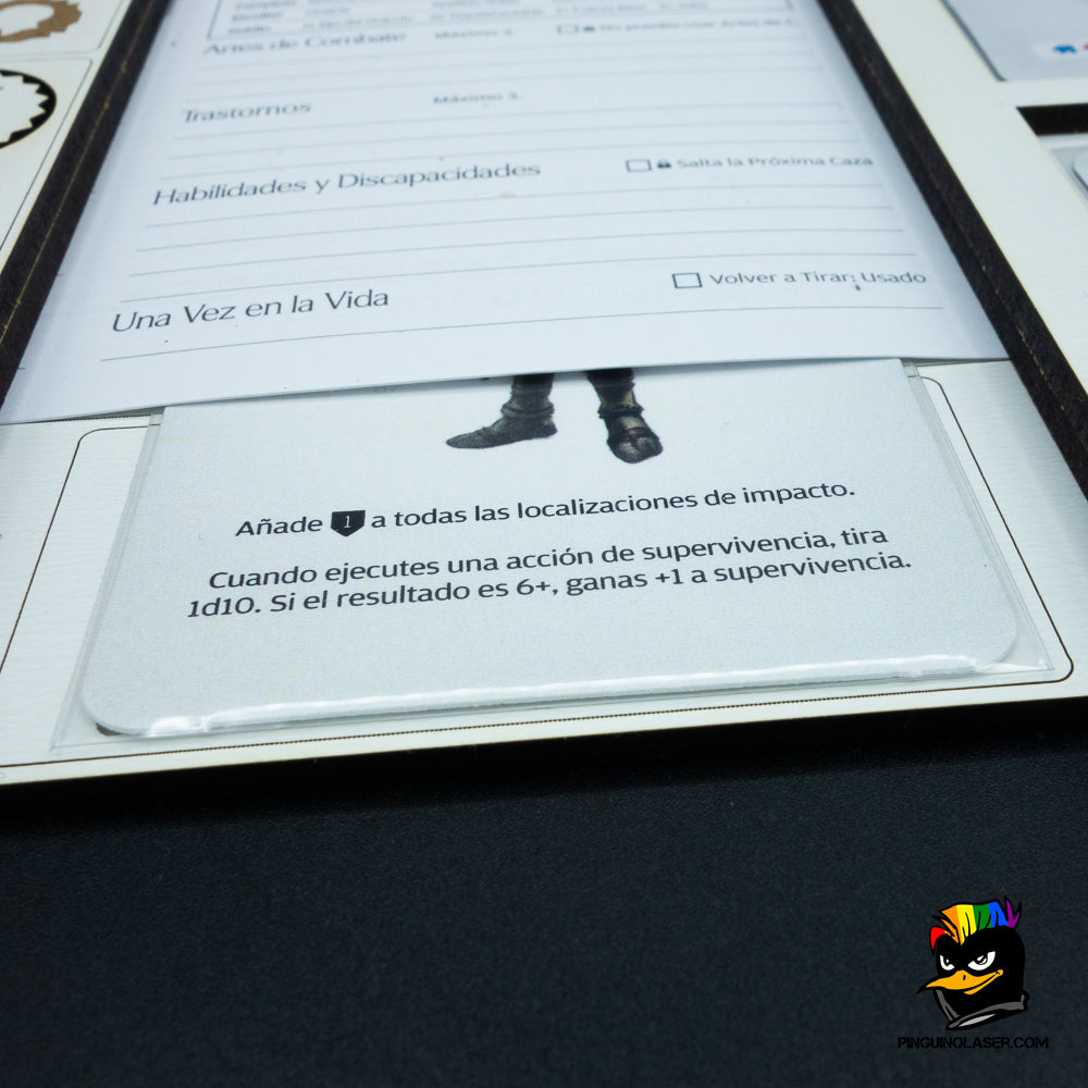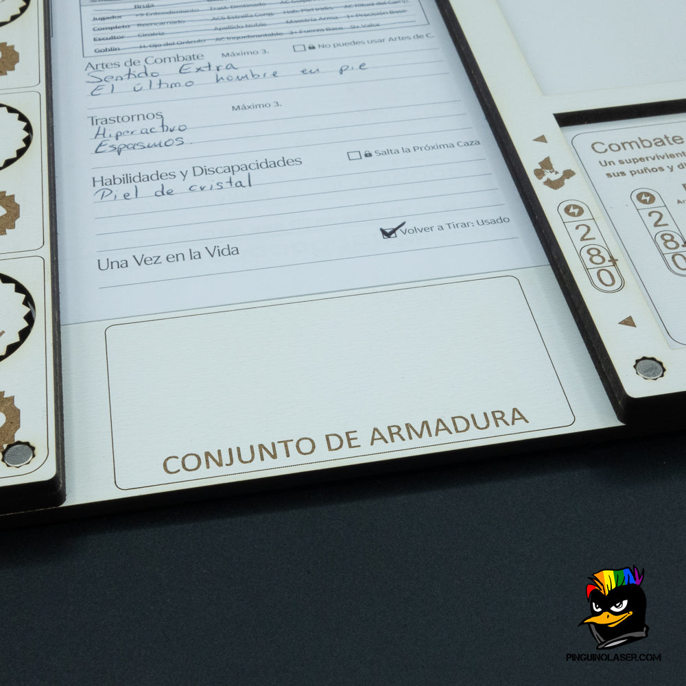 - Podrás colocar la hoja de personaje en el espacio designado para poder acceder a todo lo necesario durante tus partidas.