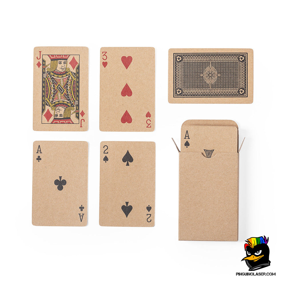 Baraja francesa, fabricada en cartón reciclado resistente. Incluye 54 naipes, presentados en estuche individual, también de cartón reciclado.